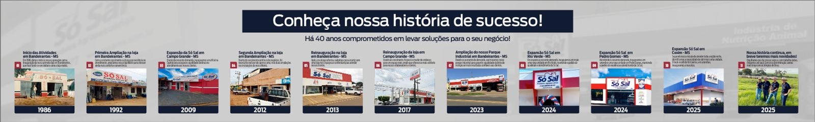 Fundada por Santo Zacarini, a Agro Só Sal se consolidou como um pilar do agronegócio em Bandeirantes-MS, onde abriga sua fábrica e loja matriz, além de 5 filiais espalhadas em Mato Grosso do Sul. Com um forte compromisso com a qualidade, a tecnologia e o atendimento especializado, a empresa construiu uma sólida reputação baseada na confiança e na parceria com seus clientes e fornecedores.